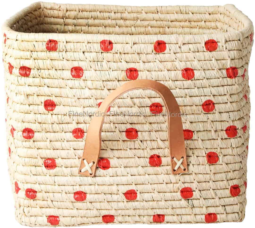 Raffia Körbe helfen Ihnen beim Aufräumen und Ordnung schaffen in Ihrem Zuhause. Genau wie auch dieser attraktive quadratische Rice Raffia Korb mit schicken Ledergriffen und bemalten Punkten. Der Korb ist 30 cm x 30 cm x 25 cm groß und darin können Sie verschiedene Kleinigkeiten und Gegenstände verstauen. Er ist eine wunderbare Aufbewahrungsmöglichkeit für Kerzen oder Teelichter, Liebesbriefe oder Postkarten, kleine Spielzeuge wie Bausteine, oder aber auch für Waschlappen, Kämme und Bürsten. Er kann in jedem Raum des Hauses verwendet werden, oder wo auch immer Sie ein paar kleine Sachen haben, die unbedingt verstaut werden sollten. Wir lieben die fröhlichen roten Punkte und die attraktiven Ledergriffe des Korbes. Dieser handgefertigte, naturfarbene Raffia Korb ist nur einer von vielen gut aussehenden Rice Körben, die wir in unserem Webshop anbieten. Schauen Sie sich gerne einmal in unserem Webshop um und sehen Sie sich alle verschiedenen Korbvariationen an, die wir anzubieten haben.