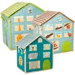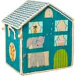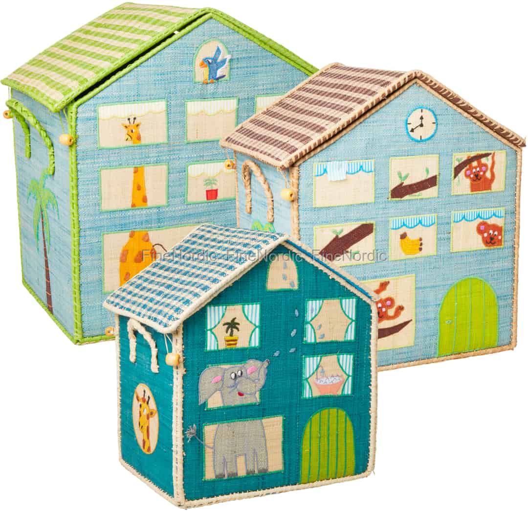 Diese Rice Raffia Spielzeugkörbe mit Dschungelhaus Thema sind als 3er-Set erhältlich. Jeder Spielzeugkorb unterscheidet sich in Größe und Aussehen voneinander. Sie sorgen für stundenlangen Spaß und fördern hoffentlich auch den Willen zum Aufräumen des Spielzeugs. Sie können sie leicht an ihren zwei Griffen tragen, falls Sie sich entscheiden, sie woanders hinzustellen. Die Dächer der Spielzeugkörbe können geöffnet werden und man kann so leicht Spielzeug rausnehmen oder auch wieder reinlegen. Mit diesen drei Spielzeugkörben kann ein mit Spielzeug verstreuter Raum in kürzester Zeit aufgeräumt werden. Sie sind auch eine attraktive Dekoration für ein Kinderzimmer. In unserem Webshop bieten wir eine schöne Auswahl an Rice Raffia Spielzeugkörben an.