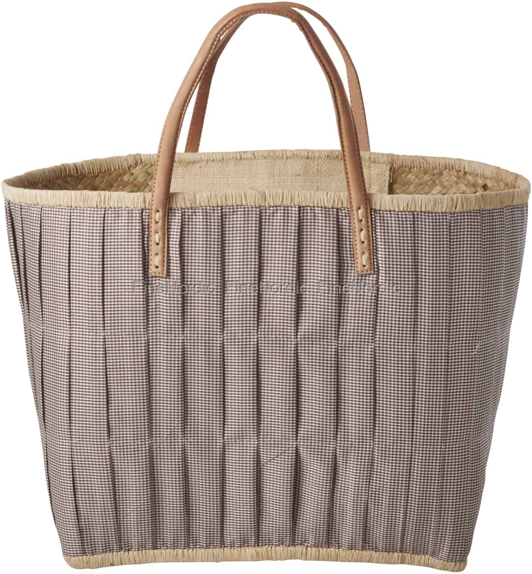 Rice Raffia Einkaufstasche - Stoffbezogen - Ledergriffe - Braun Kariert - Groß