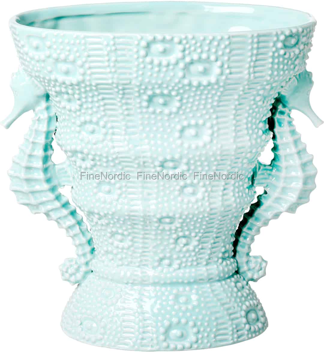 Diese große mintfarbene Vase in Seepferdchen Form von Rice ist auf jeden Fall ein Hingucker im Raum. Die 25 cm große Keramikvase zieht nicht nur wegen ihrer fantastischen Mint Farbe die Aufmerksamkeit auf sich, sondern auch wegen den reizenden Seepferdchen, die an der Außenseite der Vase angebracht sind. Rice sagt, diese Vase wird jedem Raum etwas Magisches verleihen, und wir können dem nur zustimmen. Sie sieht aus wie eine Vase die direkt von Atlantis auf unseren Tisch gelangte, oder eine, die wir uns im Meereszimmer der Disney Meerjungfrau-Prinzessin Ariel vorstellen könnten. Auch in einem maritim eingerichteten Zimmer wird sie wunderbar aussehen. Verschönern Sie Ihren Alltag mit dieser witzigen, knallfarbigen Vase von Rice.