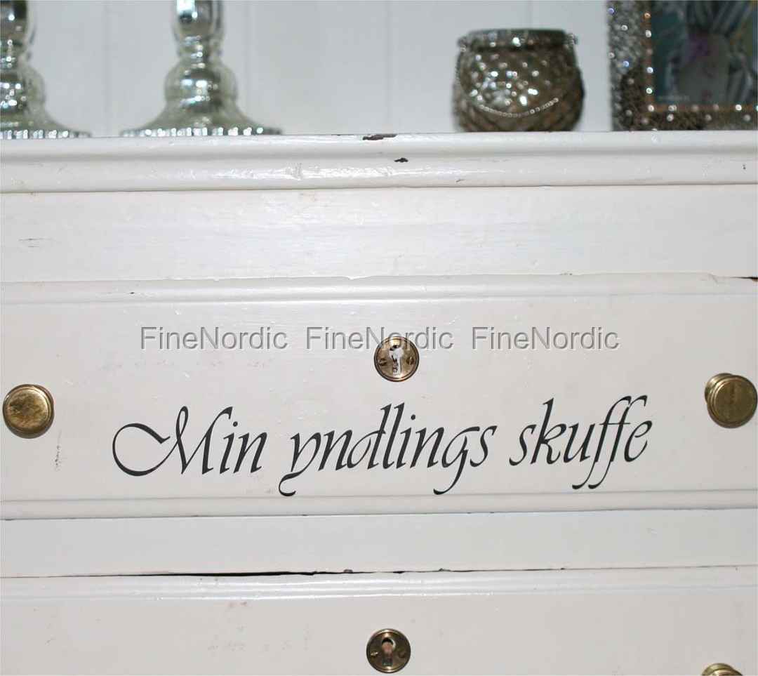 Charmanter Wallsticker / Wandtattoo mit dänischem Text "Min yndlings skuffe" (Meine Lieblingsschublade). So hübsch in nostalgischen und romantischen Wohnungen und Häusern.